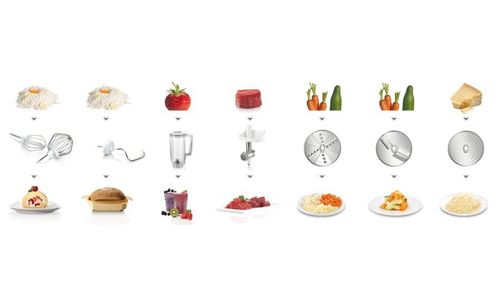 - Veelzijdig inzetbaar met de patisserie-set, continue rasp, mixer toebehoren en vleesmolen.