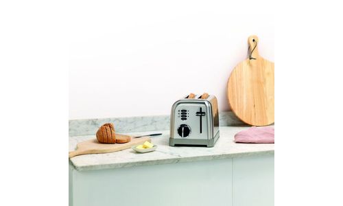 Deze elegante broodrooster met 2 sleuven in roestvrij staal staat perfect op elk deel van uw aanrecht.
