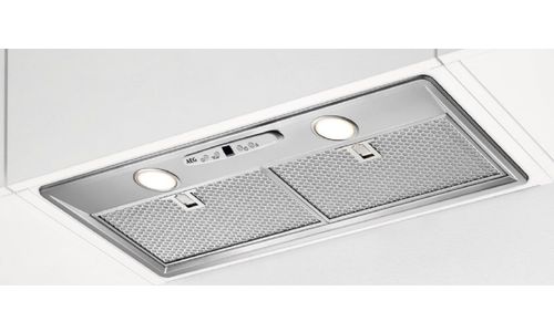 Bijna onzichtbaar op de achtergrond, in een lijn met de keukenkastjes boven de kookplaat zuigt deze dampkap discreet alle geurtjes uit de keuken weg.
