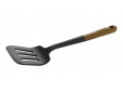 Deze spatel in mat zwarte silicone is een ideale match voor onze pannen: hij is geschikt voor producten met een antikleeflaag en krast gietijzeren of keramische producten niet. Daarnaast is de spatel hittebestendig tot 220°C, dus je kan hem ook gebruiken om te koken. Dankzij de lange, ergonomische handgreep en platte schep geraak je gemakkelijk onder voedsel zoals gegrilde vis of pannenkoeken om ze om te draaien. De drie lange gaten voorkomen dat eten aan de spatel gaat kleven en laten overtollige saus of vocht terug in de pot of pan druppelen.