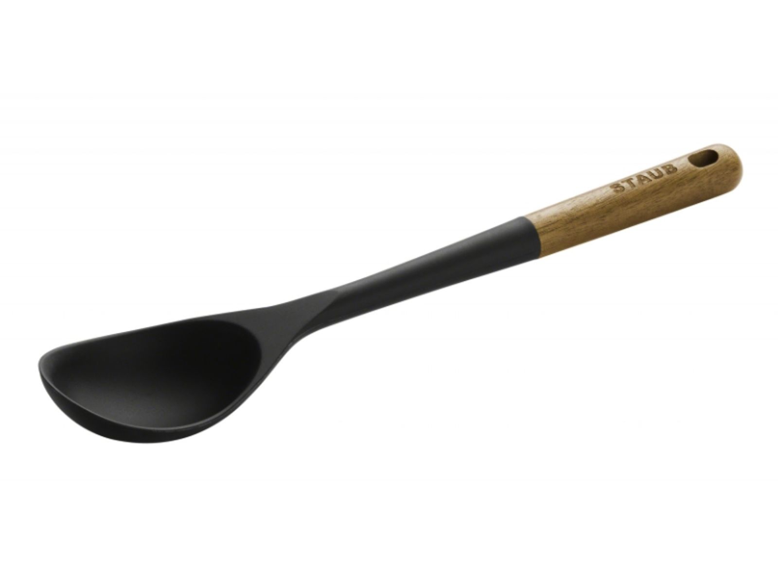Deze serveerlepel heeft een lange greep van acaciahout en een lepel in mat zwarte silicone, waardoor hij geschikt is voor gebruik in producten met een antikleeflaag of geëmailleerd gietijzer. De lepel is ook hittebestendig tot 220°C en kan gebruikt worden voor allerlei doeleinden, zoals gerechten serveren maar ook om te roeren tijdens het koken.