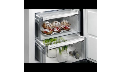 Ontdek flexibele bewaarmogelijkheden in de koelkast met de FlexiShelf. Het voorste gedeelte glijdt moeiteloos onder het andere segment en creëert zo ruimte voor het bewaren van grotere items.