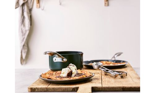 Goede dagelijkse kost maak je met goede ingrediënten, maar de keuze van de pan is minstens zo belangrijk. Wie wil koken met gezond verstand, kiest voor keramisch. Alle Dagelijkse Kost-pannen bevatten ThermolonTM, een gepatenteerde keramische antikleeflaag die gemaakt is op basis van zand en nooit schadelijke stoffen of dampen zal vrijgeven, al raakt je pan per ongeluk oververhit. Deze ThermolonTM antikleeflaag is de enige keramische coating die intussen aan zijn vijfde generatie toe is. Nog duurzamer, nog veiliger, nog slimmer gezien. De coating geleidt de warmte snel en gelijkmatig, is zonder moeite schoon te maken en zorgt voor een perfect korstje op je vlees of vis.