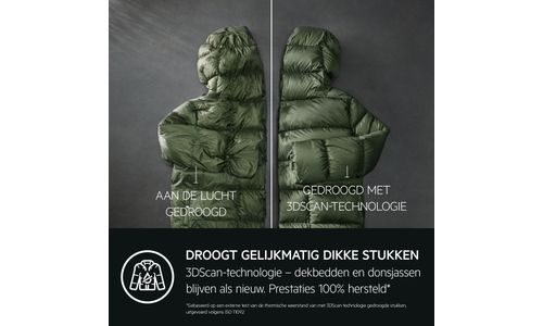 3DScan-technologie biedt de hoogste nauwkeurigheid en zorg bij drogen. Het scant tot 10 cm diep om vochtigheidsniveaus binnenin je was te lezen. Je kan erop vertrouwen dat al je wasgoed, zelfs winterjassen en dekbedden, gelijkmatig worden gedroogd en pluizig en warm blijven.