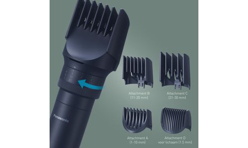 Krijg snel en nauwkeurig de look die je wilt. Gebruik de eenvoudige wijzer om de snijlengte aan te passen met een van de vier meegeleverde opzetkammen - in kleine intervallen tot 58 stappen. Van 1 mm tot 30 mm in intervallen van 0,5 mm. Je kunt zelfs gaan tot 0,5 mm door geen opzetkam te gebruiken.