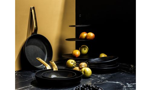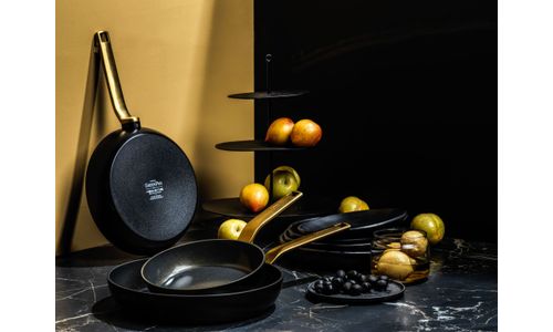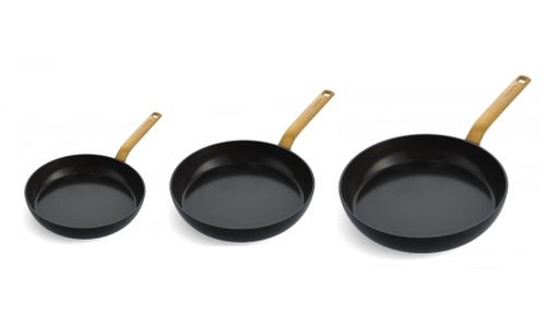 Een prachtige 3-delige set, 20 - 24 - 28 cm antikleef bakpannen met gouden handvaten! Ideaal als startersset.