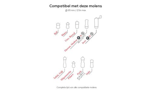 - Geschikt voor alle molens met een diameter tot 65 mm