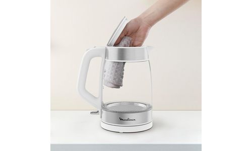 De Moulinex warmwaterkoker is eenvoudig in gebruik. Vul de waterkoker tot de gewenste hoeveelheid, plaats hem op de basis, en schakel hem in. De nauwkeurige schenktuit zorgt ervoor dat je het water zonder morsen kunt uitschenken, ideaal voor het maken van thee of koffie. Het glas is gemakkelijk schoon te maken, zodat je snel weer van je waterkoker gebruik kunt maken. Bovendien zorgt de blauwe sfeerverlichting ervoor dat je meteen ziet wanneer de waterkoker werkt.
