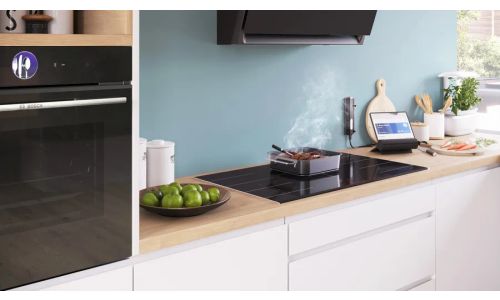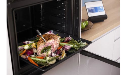 De draadloze PerfectRoast-kerntemperatuurmeter brengt je eenvoudig naar perfecte resultaten. Vier sensoren in de extra dunne naald meten de kerntemperatuur van het gerecht. De temperatuurmeter maakt via Bluetooth verbinding met de Home Connect app, zodat je het proces overal binnen Bluetooth-bereik kunt volgen. Via de app krijg je een melding als de gewenste gaarheid is bereikt en de oven schakelt automatisch uit. Mis nooit het juiste moment om je gerecht te serveren.