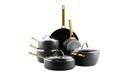 Ervaar ongeëvenaard kookgemak en duurzaamheid met deze hoogwaardige pannenset van GreenPan. Deze set, uitgevoerd in stijlvol zwart, biedt een uitstekende warmteverdeling dankzij de dikke bodem van gesmeed aluminium. De innovatieve keramische antiaanbaklaag, versterkt met diamanten, maakt koken met minder vet mogelijk, wat resulteert in gezondere maaltijden. De gouden roestvrijstalen handgrepen bieden een stevige grip en voegen een vleugje luxe toe aan elke keuken. Geschikt voor alle kookoppervlakken, inclusief inductie, en ovenbestendig tot 200 graden Celsius, biedt deze set veelzijdigheid en duurzaamheid. GreenPan staat bekend om zijn milieuvriendelijke producten van hoge kwaliteit, die bijdragen aan zowel persoonlijke gezondheid als het welzijn van de planeet.