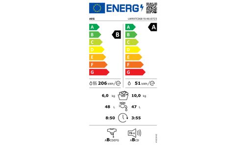 Warmtepomptechnologie droogt kleren op de helft van de temperatuur*, beschermt ze tegen onnodige warmte en bespaart tot 55% energie**. Deze technologie maakt energie-efficiëntieklasse B mogelijk voor de non-stop was- en droogcyclus.