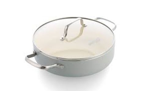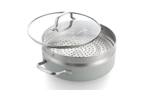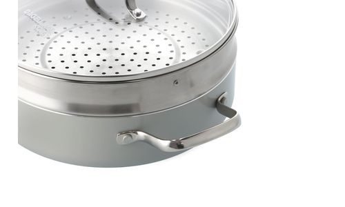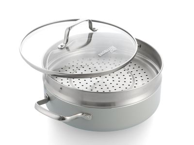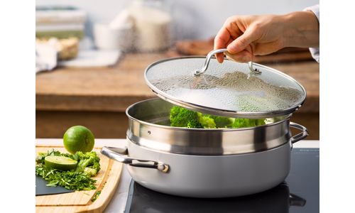 De aluminium pannen van Dagelijkse Kost hebben een keramische antiaanbaklaag, die de warmte snel en gelijkmatig geleidt. De pannen zijn zonder moeite schoon te maken en mogen ook in de vaatwas. Daarnaast hebben de pannen een ovenvaste greep in roestvrijstaal, kunnen op alle vuren inclusief inductie en zijn ovenvast tot 220°C. Echte allrounders dus, precies het soort pannen waarmee Jeroen Meus graag kookt. En het oog wil ook wat: deze collectie heeft een mooie lichtgrijze kleur en staat prachtig in elke keuken.
