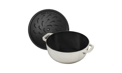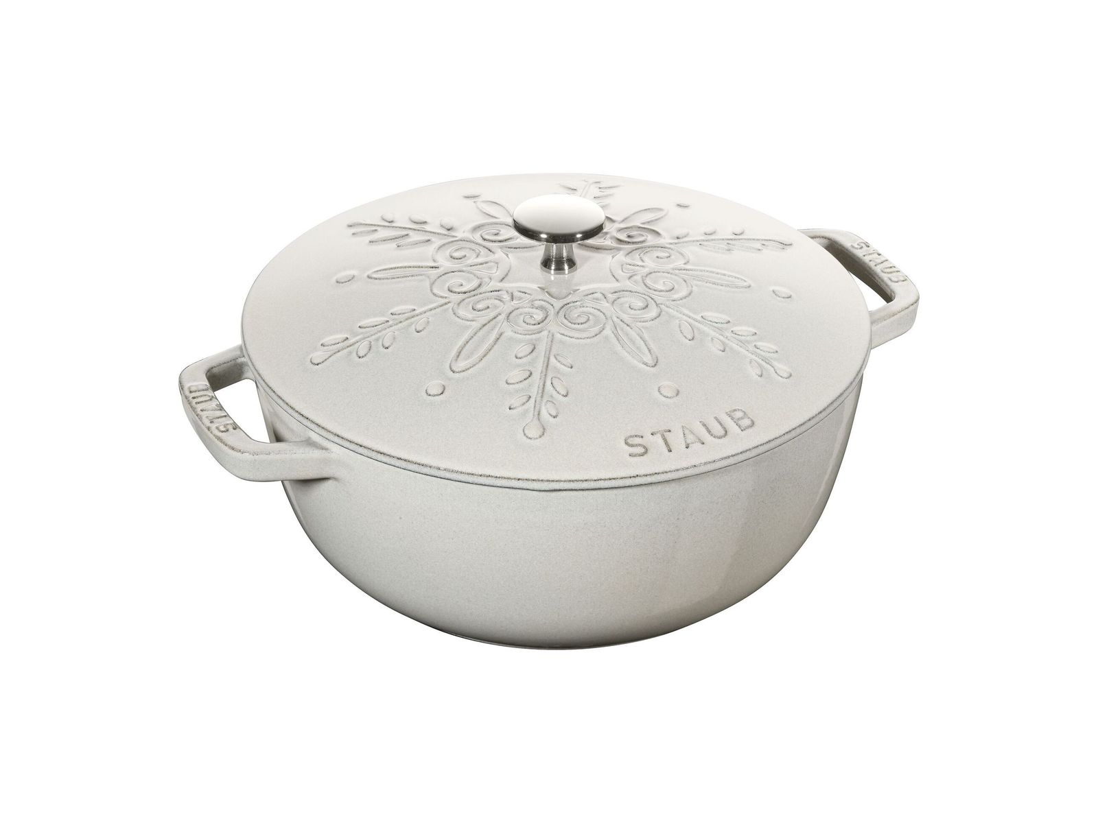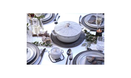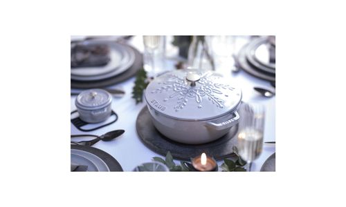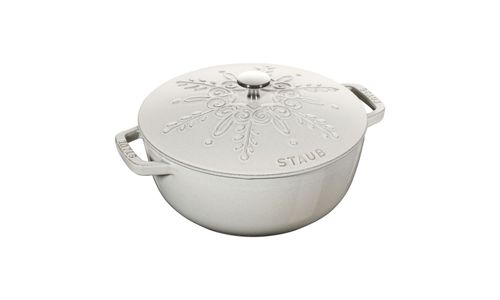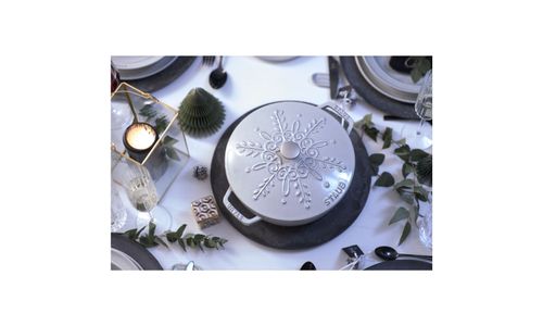 De Franse braadpan heeft dezelfde uitstekende kookeigenschappen als de Cocotte. Het geëmailleerde gietijzer verdeelt de warmte gelijkmatig voor de beste resultaten en houdt de temperatuur lang vast, zodat het eten de hele maaltijd warm blijft. De Chistera druppelstructuur creëert een Aroma Rain effect: verdampend vocht valt terug op het voedsel, waardoor vlees mals wordt en de smaak van de ingrediënten wordt versterkt. Wat deze Franse oven een zeer speciale toevoeging maakt aan elke goed ingerichte keuken en het perfecte cadeau voor fijnproevers, is de mogelijkheid om op het deksel te “tekenen”. Kies uit verschillende prachtige motieven, zoals de sneeuwvlok, op levendige kleuren. Het prachtige ontwerp laat de Franse oven echt opvallen en voegt een interessant tintje toe aan de tafel wanneer hij wordt gebruikt om te serveren. Met zijn conische vorm en de afgeronde hoeken is de Franse oven ideaal voor alle gerechten die vaak geroerd worden, zodat de kooklepel elke hoek kan bereiken. Probeer het eens met recepten zoals “groentepilaf met saffraan en kipfilet” of een romige risotto. De Franse oven is geschikt voor alle soorten kookplaten en kan ook in de oven worden gebruikt, bijvoorbeeld om brood in een perfecte ronde vorm te bakken. 24 cm diameter, rond, White Truffle Art edition gewelfd deksel met sneeuwvlokpatroon Geëmailleerd gietijzer voor hoge duurzaamheid Roestvrijstalen knop Geschikt voor alle soorten kookplaten, inclusief inductie en in de oven