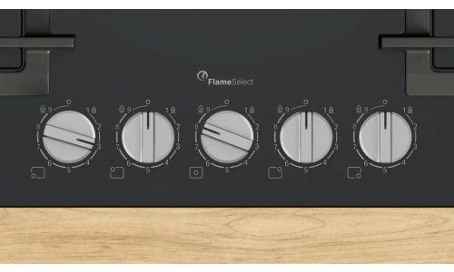 Kookplaat Serie 6 Gas 75 cm, hardglas, 5 branders, wok midden 4,0 kW, afneembare zwaardknoppen, FlameSelect, mono gietijzeren pannendragers met rubberen voetjes, geschikt voor de vaatwasser,  , zwart, randloos Zwart