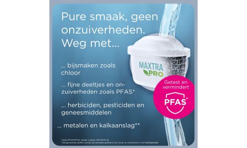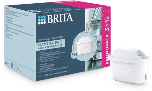 Brita Maxtra Pro Waterfilters (4st) zorgen voor een optimale filtering van uw kraanwater, zodat u altijd kunt genieten van heerlijk en gezond drinkwater. Deze filters verminderen niet alleen kalk en andere onzuiverheden, maar ook stoffen zoals PFAS die schadelijk kunnen zijn voor uw gezondheid. Met de Maxtra Pro Waterfilters geniet u altijd van zuiver en smaakvol water, geschikt voor het hele gezin.Brita Maxtra Pro Waterfilters: Zuiver en verfrissend drinkwater voor een betere smaak en gezondheidVerwijdert PFAS, kalkaanslag en andere onzuiverheden uit het waterGeschikt voor gebieden met zacht of middelhard waterNavulling voor gebruik in Brita waterfilterkannenMakkelijk in gebruik, eenvoudig te vervangenBevat 4 filterpatronen (3+1 gratis)Hoe te gebruiken?1. Voordat u het filterpatroon gebruikt, dient u deze 10 minuten in koud water te laten weken.2. Spoel het filterpatroon daarna goed af onder de kraan.3. Plaats het filterpatroon in de Brita waterfilterkan en druk deze stevig aan.4. Vul de kan met kraanwater en laat deze door het filter lopen.5. Het gefilterde water is nu klaar om te drinken. Vervang het filterpatroon na 4 weken voor optimale filtering.