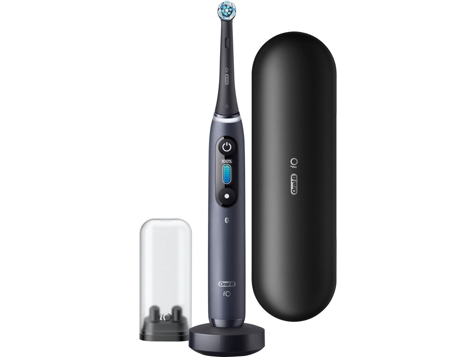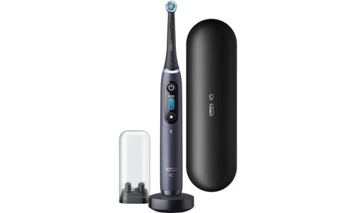 Oral-B iO8 elektrische tandenborstel met magnetische technologie en micro-vibraties, kunstmatige intelligentie, interactief LED-display, slimme druksensor, zichtbare timer, 6 standen, 1 uiteinde, reservehouder, magnetische oplader, reisset, zwart
