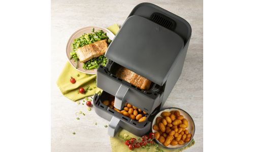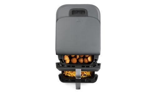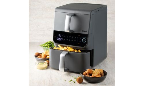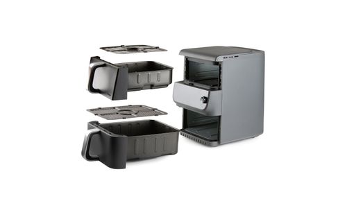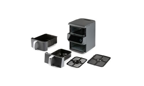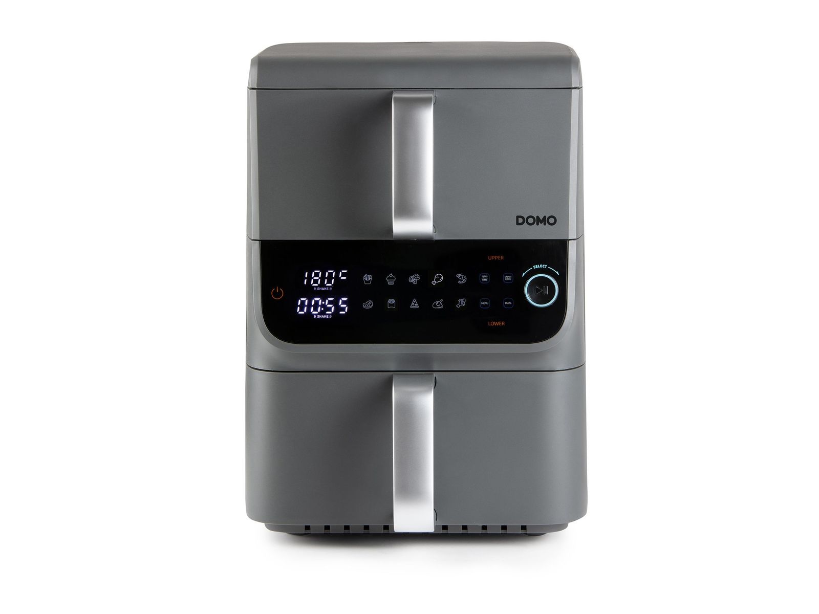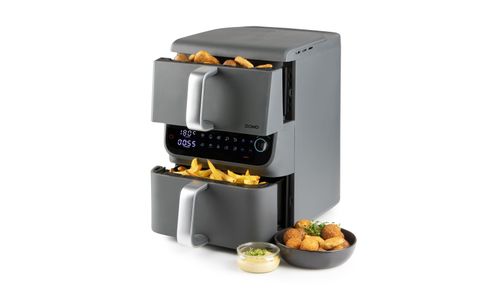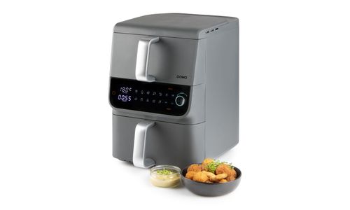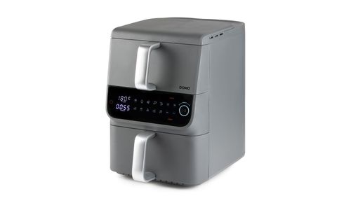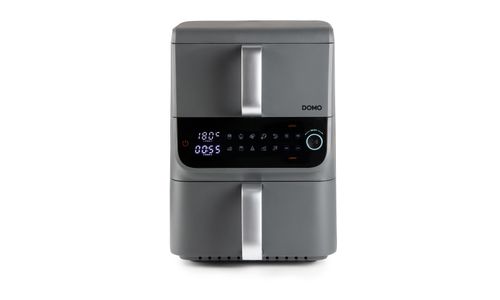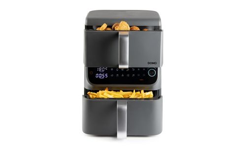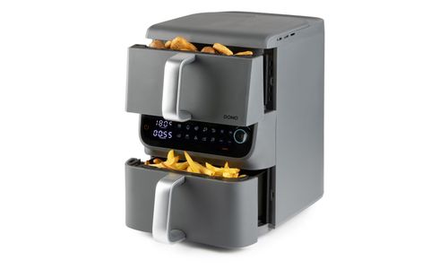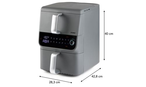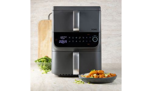 Bespaar ruimte zonder in te leveren op capaciteit met de DOMO DO549FR Dubbele Verticale Airfryer. Het ingenieuze ontwerp met twee gestapelde manden bespaart u tot 30% keukenruimte. Met een totale inhoud van 10 liter (3,5 + 6,5 L) bereidt u gemakkelijk twee gerechten tegelijk, elk met een eigen temperatuur- en tijdinstelling. Kies uit 10 automatische programma's of stel alles handmatig in via het aanraakgevoelige led-display met draaiknop. De manden kunnen worden gesynchroniseerd of identiek worden ingesteld. De manden en rekken hebben een PFAS-vrije antiaanbaklaag en zijn vaatwasmachinebestendig, en de behuizing blijft koel.