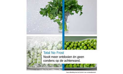 Met de Total No Frost-technologie hoef je je vriezer nooit meer te ontdooien. Het onttrekt vocht uit de lucht, waardoor er geen ijs op de wanden en je voedsel ontstaat. Dit geldt ook voor de koelkast. Zeg vaarwel tegen waterdruppels en ijsvorming op de achterwand, voor een schone uitstraling. Dit bespaart je niet alleen het gedoe van ontdooien en schoonmaken, maar het maakt je toestel ook energiezuiniger.