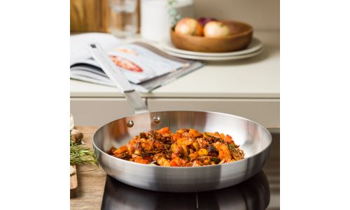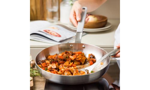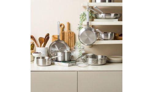 Ontdek de kracht van roestvrij staal met de nieuwe Dagelijkse kost-collectie. Professioneel 3-laags roestvrij staal met een aluminium kern zorgt voor gelijkmatige kook- en bakresultaten. Zet je het vuur hoger of lager? Dan reageren de potten en pannen onmiddellijk. Ideaal voor wie graag kookt met precisie en maximale controle.
