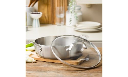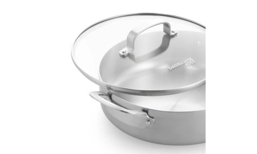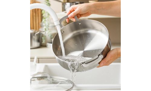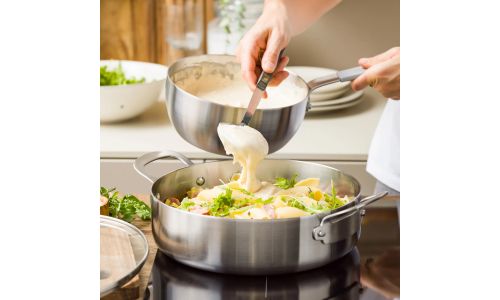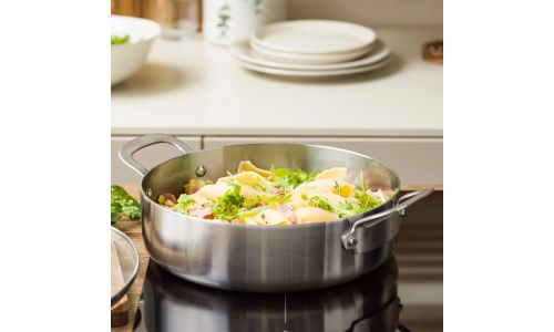 Ontdek de kracht van roestvrij staal met de nieuwe Dagelijkse kost-collectie. Professioneel 3-laags roestvrij staal met een aluminium kern zorgt voor gelijkmatige kook- en bakresultaten. Zet je het vuur hoger of lager? Dan reageren de potten en pannen onmiddellijk. Ideaal voor wie graag kookt met precisie en maximale controle.