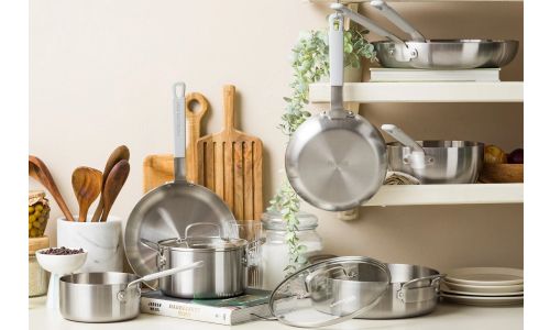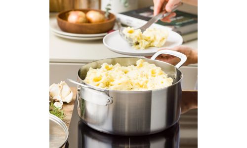 Ontdek de kracht van roestvrij staal met de nieuwe Dagelijkse kost-collectie. Professioneel 3-laags roestvrij staal met een aluminium kern zorgt voor gelijkmatige kook- en bakresultaten. Zet je het vuur hoger of lager? Dan reageren de potten en pannen onmiddellijk. Ideaal voor wie graag kookt met precisie en maximale controle.
