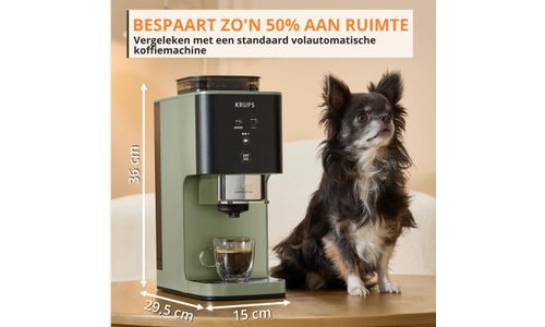 Met slechts 15 cm breed past deze machine gemakkelijk in kleine keukens of kantoren terwijl hij koffie van hoge kwaliteit levert van versgemalen bonen.