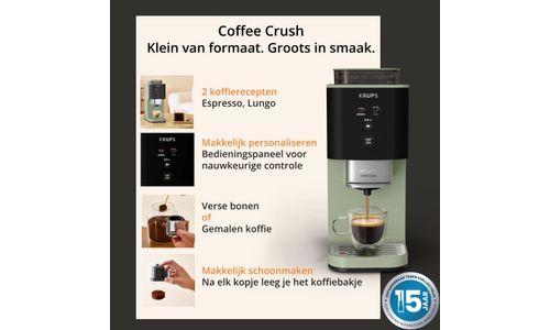 De Krups Coffee Crush SA401LE0 bereidt je favoriete dranken van versgemalen bonen terwijl hij zeer weinig ruimte op je aanrecht in beslag neemt. Hij is perfect voor dagelijks gebruik, of het nu gaat om een intense espresso of een mildere koffie.